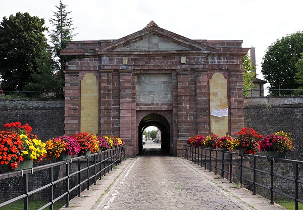 Wir parkten auf einem etwas außerhalb gelegenen kostenlosen Parkplatz, aber das wäre gar nicht nötig gewesen. Wir hätten auch innerhalb der Festungsmauern im Zentrum etwas gefunden, aber so hatten wir wenigstens einen schönen Spaziergang bei Sonnenschein. Der Rundweg führt uns durch den Park und über die Rue de Colmar vorbei an den ersten Besfestigungen durch das Porte de Colmar in die sternförmig befestigte Stadt.