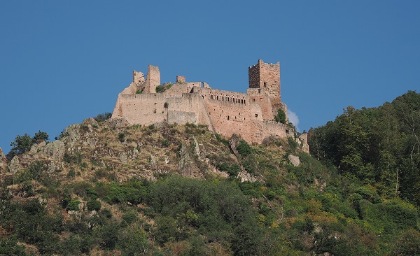 Als wir oben ankamen, haben wir erst einmal auf der gerade frei gewordenen Bank die Aussicht genossen und danach die immer noch beeindruckende Ruine erkundet. Der viereckige Bergfried ist begehbar und bietet eine wunderschöne Aussicht auf die Rheinebene bis zu den Höhenzügen des Kaiserstuhl und zum Schwarzwald. Direkt unterhalb liegt Ribeauvillé und gegenüber die zweite Burgruine Girsberg.