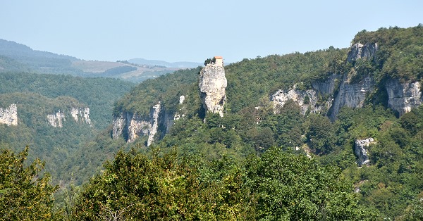 Nur 10 Kilometer Fahrt von Chiatura auf nun wieder recht verkehrsarmer Straße nach Sestaponi und man erreicht ein weiteres Highlight in der Region. Eine Abzweigung führt zu einem 40 Meter hohe Felsen, der schon vom Highway aus gut zu sehen ist. Auf dem Gipfel dieses markanten Kalksteinmonolithen befindet sich ein kleines Gebäude des daneben liegenden Klosters, so dass das Ganze ein wenig an die Bilder von Meteora in Griechenland erinnert.