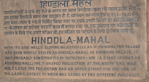 Nicht weit von dem fantastischem Bauwerk des Schiffspalastes liegt der Hindola Mahal, auch Schwingender Palast genannt. Seinen Namen hat er durch seine besondere Konstruktion erhalten. Die Grundform ist T-förmig und das Dach der langen Halle hat fünf massive Kielbögen, die etwas gotisch wirken, also in der Mitte spitz zulaufen. Hierbei handelte es sich um eine Audienzhalle, oder Durbar Hall, die ebenfalls auf die Herrschaft von Ghiyas-ud-din zurückgeht. Sie ist 30m x 18m x 12 Meter gross, die Mauern sind 3 Meter dick und weiter durch massive Schrägstrebepfeiler verstärkt. Zum Abfangen der nach außen wirkenden Kräfte sind die Längsmauern dieses Palastes an der Aussenseite nicht senkrecht, sondern nach unten hin breiter werdend angelegt, dass der Winkel mehr als 77 Grad beträgt.
