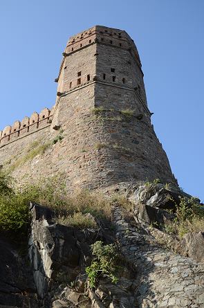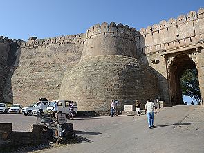 Kumbhalgarh Fort liegt so abgelegen in der Wildnis (Lat. 25º 09' N; Long. 73º 36' E), das selbst Kaiser Akbar es nicht einnehmen konnte. Alleine die düstere, scheinbar endlose Mauer mit ihren bauchigen Wehrtürmen muss auf jeden Angreifer, der noch geschwächt vom langen Anmarsch war, als unüberwindbare Barriere gewirkt haben.