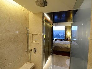 Besonders beeindruckt hat uns das Marmorbad, wir haben kurz überlegt wie man das in den Koffer bekommen könnte. Im Vorraum, den man mit einer versteckten Schiebetür vom Schlafraum trennen kann, befinden sich Waschtisch und Schranktüren gegenüber. Hinter einer mattiert beklebten Glastür befindet sich die Toilette, hinter einer anderen der Duschraum. Dieser ist so groß dass hier sogar eine Badewanne drin steht. Mitten im Raum an der Decke hängt die riesige Regenwalddusche und man macht beim Duschen den ganzen Raum nass. Endlich mal eine Dusche für den langen Michael, unter der er die Arme ausstrecken kann in alle Richtungen ohne den Duschkopf oder die Wände zu berühren. Es liegen hier natürlich auch hochwertige Pflegeprodukte bereit, es gibt einen beleuchteten Schminkspiegel, einen Föhn und Bademantel mit Hausschuhen.