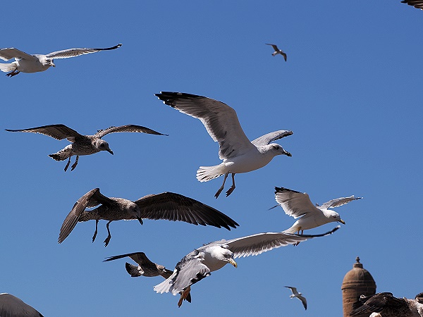 Hier in Essaouira nistet sie an der Küste, auf den vorgelagerten Inseln und auf den Dächern der Stadt und ist im Hafen und an den Stränden von Essaouira sehr präsent. Ihre großen Schwärme und ihr markantes Rufen tragen zur maritimen Atmosphäre der Stadt bei. Da hier ständig Wind weht, fliegen sie dagegen recht langsam an und sind von der neuen Hafenmauer jenseits der alten Festung besonders gut zu fotografieren.