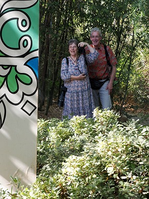 Der schöne Garten ist ja eigentlich noch nicht alt, trotzdem wirkt hier alles nicht neu, sondern vollkommen eingewachsen. Exotische Pflanzen umranken bunte Kunstwerke. Auf verschlungenen Wegen erkunden die Besucher poetische Gartenräume und Szenen. Überall ein Spiel mit Licht , Farben, Düften und Spiegeln. Dazwischen ein paar Tiere wie Schildkröten, Katzen und Frösche.