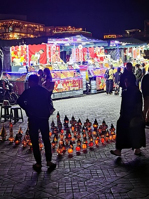 Bei Sonnenuntergang erwacht der Platz dann zum Leben, es werden zahlreiche Food-Stände aufgebaut mit lautem Trubel und geschickter Routine. Der Grill ist noch nicht an, da wird man schon angesprochen, ob man hier nicht essen will. Dabei sehen die meisten Stände gleich aus. Angeboten werden hier Spezialitäten wie Tajine, Couscous, gegrilltes Fleisch, Schnecken und Harira - eine sättigende marokkanische Suppe. Am besten sagt man, dass man sich die Standnummer merkt und später wiederkommt, dann hat man schnell seine Ruhe. Besonders skurril fanden wir die Schwarzafrikaner, welche im Dunkeln ihr Geschäft mit Sonnenbrillen betrieben.