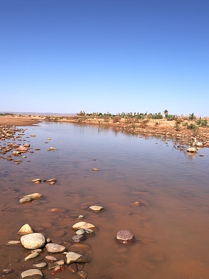 So fuhren wir mit dem Auto wieder heraus aus dem Ort und verpassten so das kleine Museum am anderen Ende von Beni Sbih. Die Straße führte über eine Brücke durch das Wadi Draa, der unten im Video bei den Überschwemmungen im September 2024 sehr viel Wasser führte.