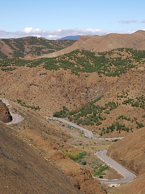Bevor man die Ebene rund um Marrakesch erreicht, führt der Weg über den spektakulären 2260 Meter hohen Tizi n'Tichka-Pass. Er wurde während der französischen Kolonialzeit in den 1920er Jahren gebaut, um Marrakesch mit den südlichen Regionen des Landes zu verbinden. Ursprünglich als strategische Verbindung gedacht, wurde die Straße schnell wichtig für den generellen Transport von Ressourcen und Gütern zwischen dem Norden und Süden Marokkos. Wir haben hier auch sehr viele Viehtransporte gesehen, lebende schwarzbunte Kühe und Schafe oben auf LKWs, auf Plattformen oberhalb der Kabine!