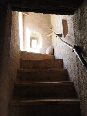 Die Gänge sind verschachtelt, mann steigt über viele Treppen und auf Grund der Deckenhöhe muss man sich oft bücken. Witzig war der Storch aus Holz, der oben auf dem Dach stand. Die Gebäude bestehen aus ungebranntem Lehm, der in Holzverschalungen unter der Beimischung von gehäckseltem Maisstroh vor Ort festgestampft und getrocknet wird. Diese fertigen Mauerteile werden mit dazwischenliegenden Querstreben übereinandergeschichtet. Beim Entfernen der Querpfähle bleiben die charakteristischen regelmäßigen Löcher im Lehm, wie sie im gesamten Süden an Stadt- und Gebäudemauern zu sehen sind.