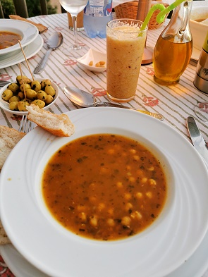 An beiden Abenden wurde ein 3-Gänge-Menü serviert: Am ersten Abend gab es als Vorspeise eine typische marokkanische Harira-Suppe mit Kichererbsen. Als Hauptgang wurde gegrillter St. Pierre-Fisch mit Kartoffeln, Karotten und Bohnen gereicht. Den Abschluss bildete eine hervorragende Crème brûlée. Alles war sehr lecker und reichlich. Dazu tranken wir Wasser, frisch zubereiteten Fruchtsaft aus gemischten Früchten und zum Dessert zwei Latte Macchiato.