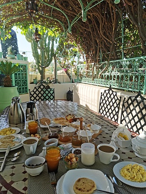 Wir haben das schöne Ambiente hier oben immer sehr genossen. Die zwitschernden Vögel bei ihren Besuchen beobachtet, den Muezzin gehört und uns über die Leckereien auf dem Tisch hergemacht. Hervorzuheben sind hier vor allem die leckeren, in einer Tajine gekochten Eier in scharfer Tomatensauce. An einem anderen Morgen bekamen wir ein leckeres Rührei.