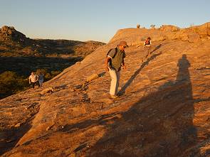 Der Sonnenuntergang auf den Granitfelsen in kleiner Runde war noch wesentlich schöner und idyllischer als der Sunset Walk von der Lodge aus. Bei unserer Ankunft machte sich eine Gruppe scheuer Paviane aus dem Staub. Charles packte die Getränke aus und jeder fand sein Plätzchen. An diesem Abend gab es nicht eine einzige Wolke am Himmel und so fehlte das Farbenspiel am Himmel, nachdem der glutrote Ball hinter einer Bergkette verschwunden war. Für den Weg zurück gab es noch genug Licht, aber wir mussten ja noch zur Lodge zurück. Es wurde schnell dunkel, wie in diesen Breiten üblich und der Landrover pflügte auf der Piste vorbei an fast hüfthohem Gras.