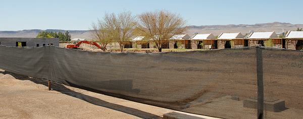 Von der Hauptstraße ist das Resort gut ausgeschildert und die Anfahrt durch die grünen Traubenplantagen zeigt was künstliche Bewässerung in ariden Regionen leisten kann. Dann standen wir unvermittelt vor Obst-Hallen und einem offensichtlichen Gewerbegebiet und dahinter befand sich eine Baustelle. Nach kurzer Orientierungslosigkeit fanden wir dann doch das Haupthaus mit der Rezeption, wo wir uns beim Manager anmeldeten. Danach durften wir uns ein Zimmer aussuchen. Zur Flussseite ist das Resort sehr schön, es gibt saftig grünen Rasen, einen sehr schönen Pool und direkten Blick auf den Oranje River.