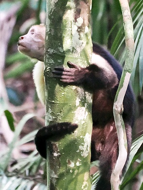 Später hatten wir dann noch merh Glück und eine ganze Bande Kapuzineraffen kam oben in den Baumkronen entlang und überquerte auch den Wanderweg. Sie leben ebenfalls in Gruppen von ca. 10 bis 20 Tieren – Weibchen, Jungtiere und ein oder mehrere Männchen. Der frühe Morgen ist Futterzeit – sie durchstöbern das Blätterdach, suchen nach Früchten, Insekten, kleinen Wirbeltieren oder Eiern. Manchmal klettern sie auch in niedrigere Sträucher oder gehen zum Bach hinunter, dann kann man sie noch besser fotografieren.
