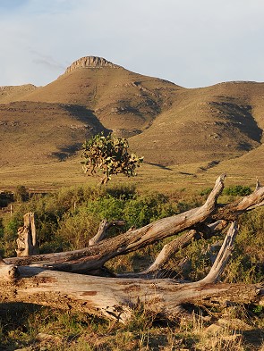 Hier findet man meist nur Zwergsträucher, Gräser in höheren, feuchteren Lagen und einige Sukkulenten. Die Vegetation ist niedrig, angepasst an Trockenheit, Frost und Beweidung. Herausstechend waren natürlich die großen Pappeln zwischen Haus und Damm sowie ein schon zum Baum gewachsener Feigenkaktus.
