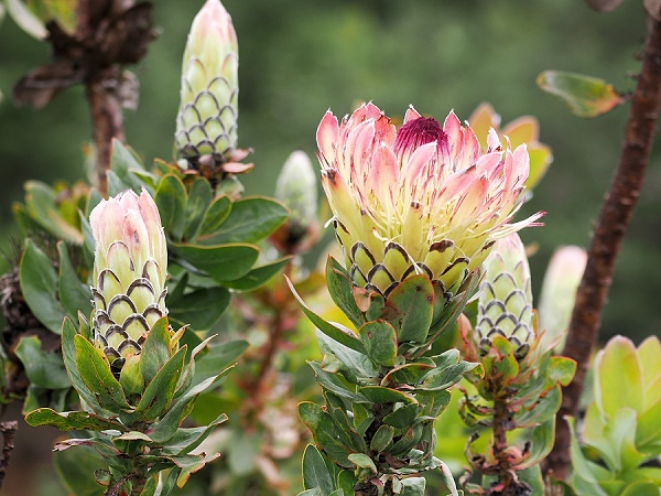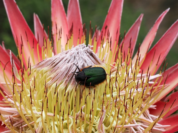 Die Prachtvolle Königsprotea (Protea cynaroides) ist ganz zu Recht die Nationalblume Südafrikas. Mit dicker Borke an ihren Zweigen ist sie ziemlich resistent gegen Buschfeuer und überlebt unbeschadet die relativ häufig vorkommenden Grasbrände.