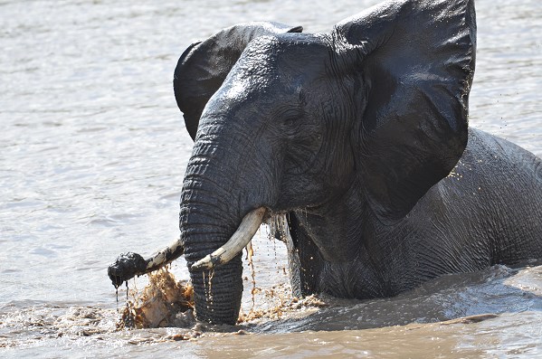 Es macht immer wieder Spaß, an einem Wasserloch oder an einem Flussufer stehen zu bleiben, wenn Elefanten in der Nähe sind. Denn dann kann man fast sicher sein, dass mindestens einer davon ins Wasser geht. Und einem der mächtigen grauen Riesen beim Planschen zuzusehen, das ist ein ganz besonderer Anblick. Wenn sie fast schwerelos im Wasser treiben, sich am Rand mit Schlamm bespritzen und manchmal nur noch der Rüssel wie Nessie das Ungeheuer aus dem Wasser ragt. Nass sind sie besonders schön und dunkel-glänzend steigen sie dann aus den Fluten.