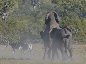 Plötzlich kam vom Waldrand her ein älterer, mächtiger Bulle am Wasserloch, dazu noch mehrere etwas jüngerere Elefantenbullen. Sie waren der Herde gefolgt. Es folgte keine Begrüßung, wie unter Elefanten üblich, sonders es erscholl ein lautes Trompeten und es gab eine kleine Rangelei neben dem Tank. Kurz verschwand die Herde mit dem Bullen nach links hinter einer Buschreihe, die anderen Bullen blieben neben dem Tank zurück. Dann rannte von links eine Elefantenkuh in die Ebene hinein, verfolgt von dem großen Bullen. Auch ein zweiter Bulle nahm vom Tank aus Kurs auf sie und plötzlich erschienen weit hinten am Waldrand noch zwei weitere alte Bullen. Doch der erste war schneller, verfolgte die Kuh ein Stück, selbst die anwesenden Zebras sprangen ein wenig zur Seite. Als er sein Ziel erreicht hatte und die Paarung begann, drehte der Verlierer hinter den beiden zur Seite ab und auch die anderen Bullen kamen nicht zum Trinken, sondern verschwanden wieder im Wald.