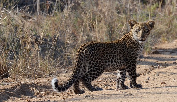 Auf Grund der Trockenheit war das Buschwerk ziemlich licht und wir konnten das Auto wenden und die Beiden eine Zeit lang begleiten. Die Leopardin legte sich hin, während er sein Revier markierte und ab und zu mal zärtlich an ihre Nase stupste. Als sie weiter liefen sah das irgendwie komisch aus und wir konnten sie immer noch verfolgen, weil sie sich parallel zur Straße bewegten. Dann kapierten wir endlich, was uns komisch vorkam: einer der Leoparden war kleiner. Die beiden hatten ihr Jungtier dort im Busch abgeholt und liefen nun zu dritt. Direkt vor uns überquerten sie wieder die Straße, diesmal ohne uns anzusehen und das Kleine war immer von einem Elternteil verdeckt.