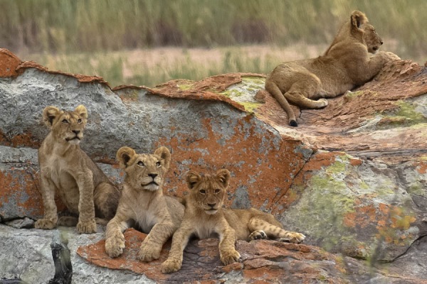Kurz vor Lower Sabie hatten wir dann Glück und sahen endlich mal Löwen auf den markanten Felsen, die sich kurz vor dem Sunset Dam am Flussufer befinden. Wir konnten eine Lücke zwischen zwei Fahrzeugen nutzen, um schnell ein paar Fotos zu machen, die Jungtiere standen gerade auf und liefen ins sandige Flussbett. Etwa dreißig Autos in drei Reihen blockierten die ganze Straße, teilweise hatte man null Sicht auf die Tiere, die flach im Gras lagen.
