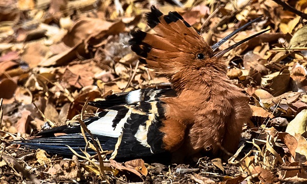 Der letzte und bekannteste Vertreter der Familie ist der Wiedehopf (Upupa epops - Eurasian hoopoe), die einzige Art aus der Vogelfamilie der Wiedehopfe (Upupidae). Der hübsche Vogel misst durchschnittlich 28 cm vom Schnabel bis zur Schwanzspitze und man kennt ihn auch in Mitteleuropa. Im Kruger kann man ihn aber wesentlich einfacher beobbachten. Charakteristisch sind die kontrastreich schwarz-weiß gebänderten Flügel mit deutlichen gelben Einschlüssen und der lange, gebogene Schnabel. Ausserdem besitzt ein Wiedehopf eine etwa fünf bis sechs Zentimeter lange aufrichtbare Federhaube, deren Enden in einem weiß-schwarzen Abschluss auslaufen. Der Schwanz ist schwarz mit einer breiten weißen Binde etwa im letzten Schwanzdrittel und einer weißen Zeichnung auf der Schwanzwurzel. Der übrige Körper ist rostbraunrot.