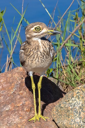 Wer in der Nacht oder der Dämmerung unterwegs ist, der kann dem Kaptriel (Burhinus capensis - Spotted thick-knee) begegnen. Auch tagsüber sitzt er manchmal reglos im Schatten oder im dichten Gebüsch, wo man ihn schwer erkennen kann. Wir hatten schon oft Glück ihn auch am Tag zu sehen. Die Art ist in Afrika sehr weit verbreitet und ein häufiger Brutvogel in ariden und semiariden Regionen südlich der Sahara. Die Nahrung besteht aus Würmern, Insekten, Reptilien und Samen. Dann gibt es noch den Wassertriel (Burhinus vermiculatus - Water thick knee) und den auffälligen Stelzenläufer (Himantopus himantopus - Black-winged stilt) mit seinen extrem langen, roten Beinen und einem schwarzen, nadelfeinen, geraden und langen Schnabel.