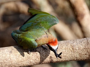 Der Zwergspint (Merops pusillus - Little bee eater) ist auf der Oberseite grün, die Kehleist gelb, auf ein schwarzes Halsband folgt eine kastanienbraune Brust, die zum Bauch hin zu Beige verblasst. Die Flügel sind grün-braun und der Schnabel schwarz. Der Zwergspint wird 15 bis 17 Zentimeter lang und ist damit die kleinste Bienenfresserart im Nationalpark.