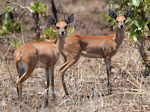 Nachdem wir das Muntshe Wasserloch passiert hatten, entschlossen wir uns für das Verlassen der Hauptsraße und fuhren auf der Gravel Road S122, dem Muntshe Loop, weiter in Richtung Süden. Landschaftlich eine sehr schöne Strecke, denn auf der rechten Seite liegt ein lang gestrecktes Felsmassiv namens Muntshe Koppie. Darüber kreisten Raubvögel und wir sahen auf der Ebene davor einige Steenböckchen, die meist als Paare unterwegs sind. Dazu ein paar Gnus im Schatten unter einem Baum und Strauße.