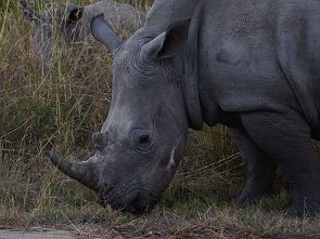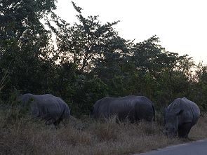 Als wir am späten Nachmittag kurz vor Sonneuntergang nach einer Rundfahrt über die Napi Road fuhren, sahen wir endlich drei Rhinos die gerade hinüber wollten. Leider hatten wir nicht mehr viel Zeit sie ausgiebig zu beobachten, denn vor Schließung der Tore um 18:00 Uhr mussten wir wieder im Pretoriuskop Camp sein. Da ein Overlander Bus kam haben sie sich sowieso erschrocken und sind schnell im dichten Gras verschwunden und wir konnten unsere Fahrt fortsetzen. Der Bus hatte sicher Probleme noch das Numbi Gate zu erreichen.