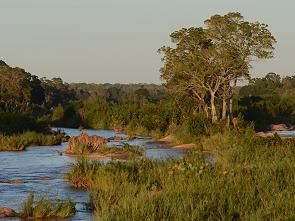 Die Straße überquert den Sand River und hier von der Brücke aus hat man immer einen schönen Blick auf Tiere. Oft liegen Krokodile auf der Sandbank am Ufer, Hippos spielen im Wasser und tauchen prustend auf und zahlreiche Wasservögel sind am Ufer zu sehen. Leider ist der Verkehr hier meist heftig und die Brücke schmal, so dass man nicht sehr lange zum Beobachten stehen bleiben kann.