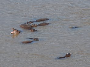 Eines der Hippos im Familienverband direkt unter dem Aussichtspunkt war etwas Besonderes. Das arme Tier hatte sicherlich bei einem Kampf einen Teil des Oberkiefers verloren. Hell leuchteten die nun frei liegenden Stoßzähne im Wasser. Ein sehr markantes Tier, das sicher von jedem Besucher hier fotografiert wird.