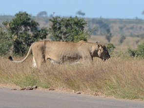 Ein wenig weiter südlich auf der H10 in Richtung Lower Sabie fährt man durch eine weite Graslandschaft. Hier soll man oft die Gelegenheit haben, Löwen zu beobachten. Mitten am Tag hatten wir da keine Sichtung erwartet. Doch plötzlich teilte sich das Gras am Wegrand und zwei Löwinnen liefen direkt vor uns über die Staße, ohne unserem Auto auch anzusehen. Im schnellen Trab verschwanden sie auf der anderen Seite im hohen Gras, kaum noch zu erkennen. Nur an der Bewegung und weil wir wussten, wo sie waren. Weit und breit war kein anderes Auto zu sehen.
