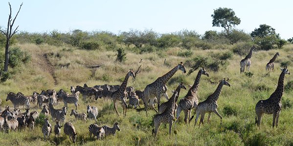 Während wir noch den Kampf filmten, der leider im Gegenlicht stattfand, tat sich im grünen Flusstal hinter unserem Auto einiges. Immer mehr Zebras, Strauße und Impalas kamen über einen Hügel und grasten am Fluss. Dazu erschienen immer mehr Giraffen. Über 20 Stück sieht man im Kruger eher selten zusammen. Immer mehr lange Hälse guckten aus den umliegenden Büschen. Die Zebras näherten sich dem Fluss um zu trinken und wir verrenkten uns im Auto fast den Hals, denn alles fand hinter uns statt und wir wollten die Tier nicht durch das Starten des Motors erschrecken.