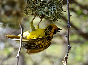 Hier waren es nicht ganz so viele, aber die Männchen der Maskenweber (Ploceus velatus) waren jetzt kurz vor der Balz eifrig mit dem Nestbau beschäftigt. Den Anfang macht ein einziger rundgebogener Grashalm, um den stetig neue Halme gewoben werden. Die einzigen Werkzeuge, die der Webervogel hat, sind dabei sein Schnabel, um zu weben und seine Füße, um alles in Form zu ziehen. Und wir konnten sie hier recht nah betrachten, denn die Nester hingen direkt in den Bäumen am Rand eines Gewässers, in dem sich die Krokodile befinden.