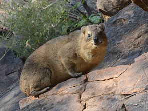 Der Weg gabelt sich, zum Loop fährt man nach links über einen felsigen Bergsattel, an dem einige Klippschliefer herumspringen. Dahinter sahen wir dann endlich eine Gruppe Elefanten, kurz vor der Abzweigung zur Ranger Station. So mussten wir ein wenig warten, bis die Tiere vorbei gezogen waren.
