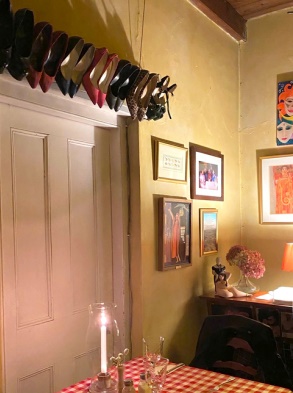 Der Besuch war ein rundum gelungenes Erlebnis, man sitzt wie in einem privaten Wohnzimmer und wird mit einem Drei-Gänge-Menü liebevoll umsorgt. An den Wänden eine krude Mischung aus Schuhen, Hüten und Masken.