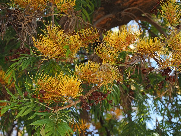 Eindrucksvoll sind auch die markanten Blüten der Silbereiche (Grevillea robusta). Der Baum stammt ursprünglich aus den subtropischen Regionen Ost-Australiens. Die Blätter sind farnartig und haben eine silbrig-weiße Unterseite, was dem Baum seinen Namen verliehen hat. Die leuchtend gelb-orangen Blüten wachsen in bürstenartigen Formationen und sind sehr reich an Nektar, weshalb sie oft Vögel und Insekten anlocken.