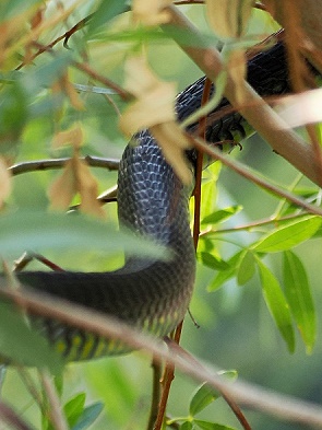 Plötzlich fingen die kleinen Vögel an zu schimpfen und zu zetern und hörten gar nicht mehr auf. Im dichten Busch an der Terrasse waren viele Blätter, aber die kleinen Vögel flogen immer wieder schimpfend dahin. Die Ursache haben wir schnell erspäht: eine Schlange lag dort. Als sie uns sah, bewegte sie sich schnell innerhalb vom Busch an eine andere Stelle.