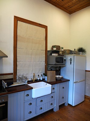 Gegenüber befindet sich die gut ausgestattete Küche im Landhausstil, die auch einen eigenen Eingang zum Parkplatz hin hat. Es gibt einen Ofen, einen großen Kühlschrank, eine Mikrowelle. Hier hängen auch alle Schlüssel für die verschiedenen Türen.