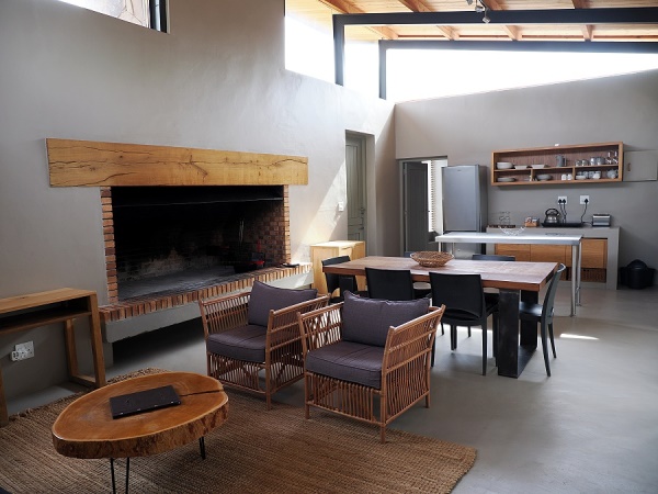 Es gibt einen Innen- und Außen-Braai sowie einen Kamin für kühlere Winterabende. Dazu gemütliche Sofas und eine große überdachte Terrasse mit Schiebetür. Nur die zwei schweren Stühle draußen fanden wir etwas unbequem, aber Kissen waren vorhanden. Einen Fernseher sucht man hier vergeblich – man wohnt hier wegen Ruhe und Naturerlebnis.