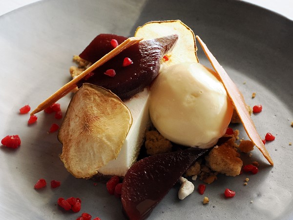 Käsekuchen mit Lavendeleis bildete den Abschkuss für Michael und ich hatte sich für eine Mousse aus Ziegenkäse und weißer Schoko mit Rotweinbirne und Frischkäse-Eis entschieden. Ein Träumchen.
