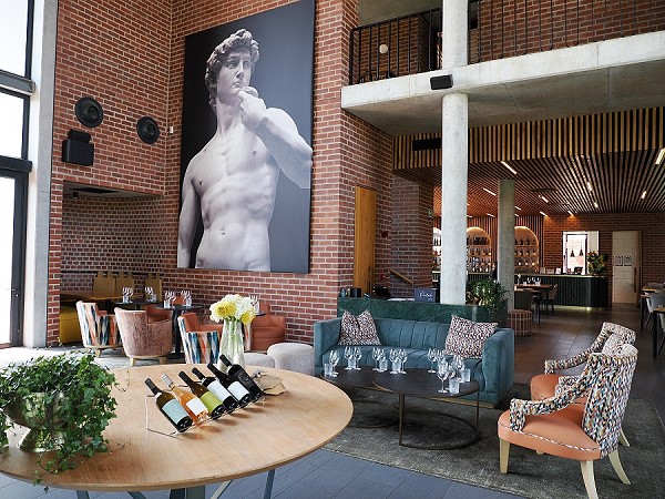Die Architektur ist durchaus beeindruckend. Backsteinbauten mit großen Fenstern, eine Terrasse mit Blick auf die Berge und gepflegte Gärten in Lila und weiß erzeugen eine Atmosphäre, die südafrikanische Landschaft mit mediterranem Flair verbindet. Man kann in den Weinkeller blicken, die Decken sind extrem hoch und die Bilder an der Wand Extra-groß. Alle Tische waren eingedeckt, als wir kamen.