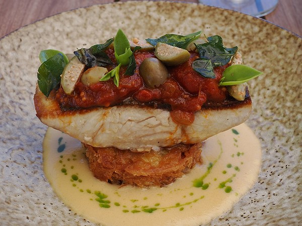 Danach hatte Michael wunderbar zarte Lamschulter mit Kartoffelscheiben-Würfel und Gemüsetopping. Ich Yellowtail auf Rösti mit Beurre blanc und Tomatengemüse.