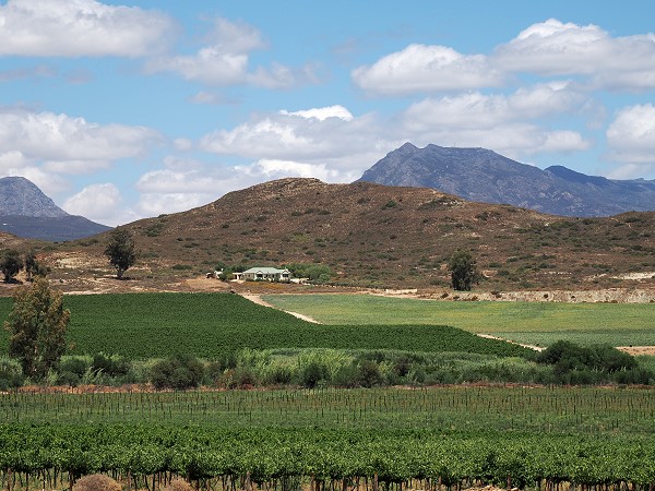 Beim nächsten Besuch werden wir vorher weniger einkaufen und dann auch mal die örtliche Gastronomie testen. Dieses Mal waren wir noch einmal in unserem Leiblingsrestaurant in Bonnievale, dem Kapokbos auf der Weinfram Weltevrede zum Mittagessen. Da sind wir über die Gravel Road im Südosten von McGregor hingefahren, vorbei an Feldern und Farmen.