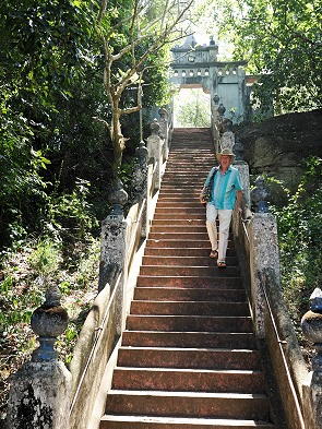 Der krönende Abschluss ist die oberste Terrasse mit einer kleinen weißen Dagoba auf der Spitze des Felsens. Die letzten Treppen sind sehr abenteuerlich, wir sind links hochgegangen, jede Stufe ist schmal und hat eine andere Höhe. Noch abenteurlicher sind die Stufen auf der rechten Seite, die flach in den Fels gehauen wurden. Hier sind wir wieder runter, es sah von oben schlimmer aus als es war, denn man konnte sich überall an einem eisernen Geländer festhalten.