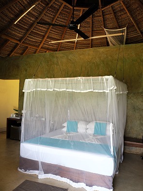 Im Zentrum steht ein großzügiges Doppelbett, das mit einem schönen Moskitonetz rundum ausgestattet ist. Das braucht man auch, denn die Lüftungsöffnungen rundum haben zwar ein grobes Netz gegen Vögel und Kleintiere, für Mücken ist das aber kein Hinderniss. Die Bettwäsche besteht aus feiner Baumwolle, um den tropischen Temperaturen gerecht zu werden. Zwei weitere Betten befinden sich oben auf einer Empore für mitreisende Kinder. Statt Plastikflaschen findet man im Zimmer meist wiederauffüllbare Glasflaschen.