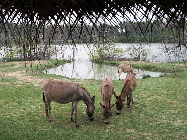 Überall im Resort findet man natürliche Materialien und das Farbkonzept mit Türkis und Weiß. Auf den Rasenflächen grasen wilde Esel und auch ein paar Pferde, die man für Ausritte mieten kann.