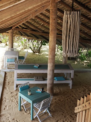 Die Chalets betonen den rustikalen Eco-Chic des Resorts mit Fokus auf Nachhaltigkeit und natürliche Materialien. Schön ist der Außenbereich mit bequem gepolsterten Sitzbänken, zwei Liegestühlen und einer Hängematte. Man hat sogar einen eigenen kleinen Steg an der Lagune, der für die Liegestühle aber ziemlich klein ist.