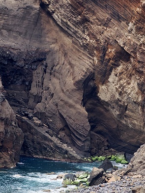 Fajã - eine flache Küstenebene am Fuß einer Steilküste, durch Lava oder Erdrutsch entstanden.