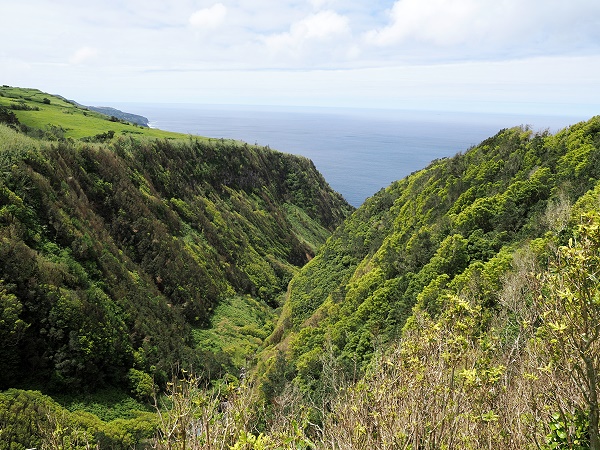 Von hier aus hat man einen fantastischen Blick über die steilen, dicht bewachsenen Schluchten der Ribeira das Cabras, ein tief eingeschnittenes Tal, das sich durch das Inselinnere zieht. Besonders nach Regenfällen rauscht hier das Wasser in Richtung Atlantik, was den Ort zusätzlich spektakulär macht. Bei unserem Besuch war es aber trocken und leider ziemlich wolkig.