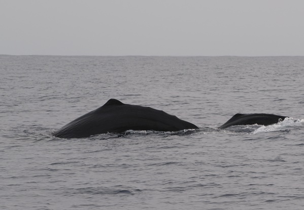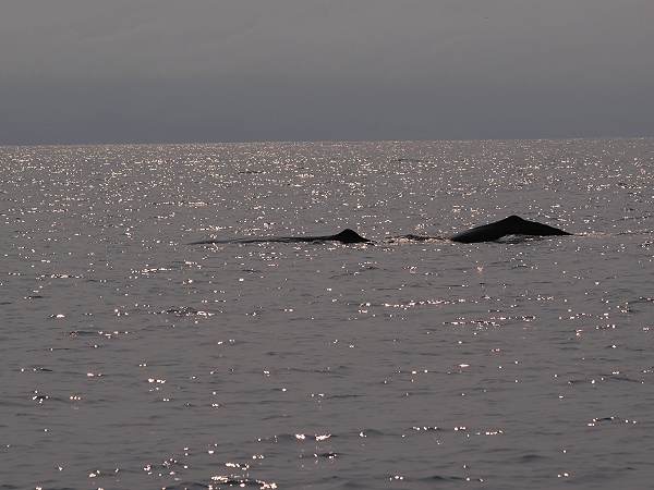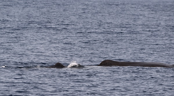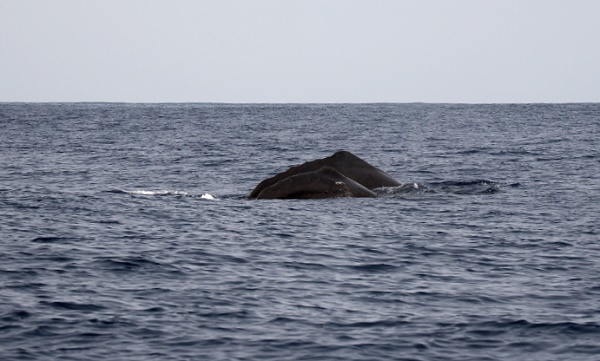 Unsere ersten Sichtungen waren eine in mehreren Grüppchen verteilte große Anzahl Pottwale, an diesem Tag etwa 20 Tiere. Einige Weibchen waren mit Jungtieren unterwegs und die Boote wurden zu verschiedenen Gruppen dirigiert, so dass immer nur wenige Boote zu einer Sichtung fuhren. Es waren genug für alle da, denn Pottwale leben in Familien und wo einer ist, da sind meist auch noch andere.